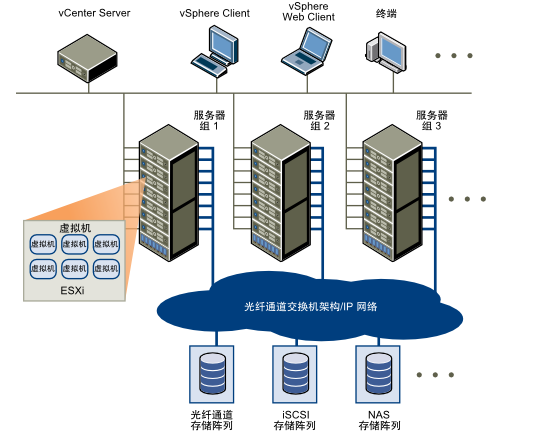 如果在小型拓扑环境下管理员可以使用vSphere client ,小巧,方柏霓管理ESXI服务器,但是如果在大型拓扑环境下,就要使用vCenter server,